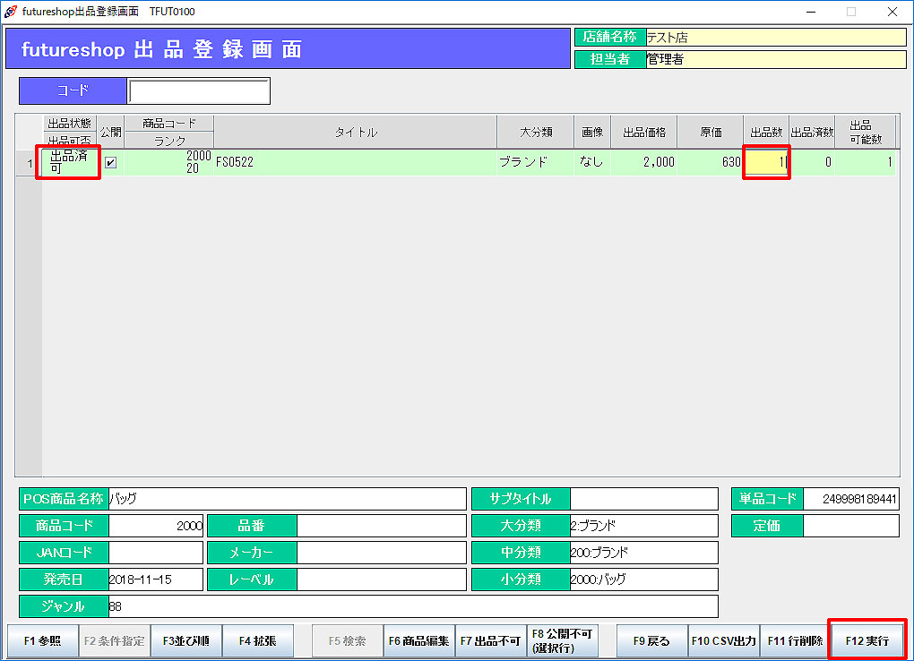 出品状態が「出品済」、出品数に「1」が入っていることを