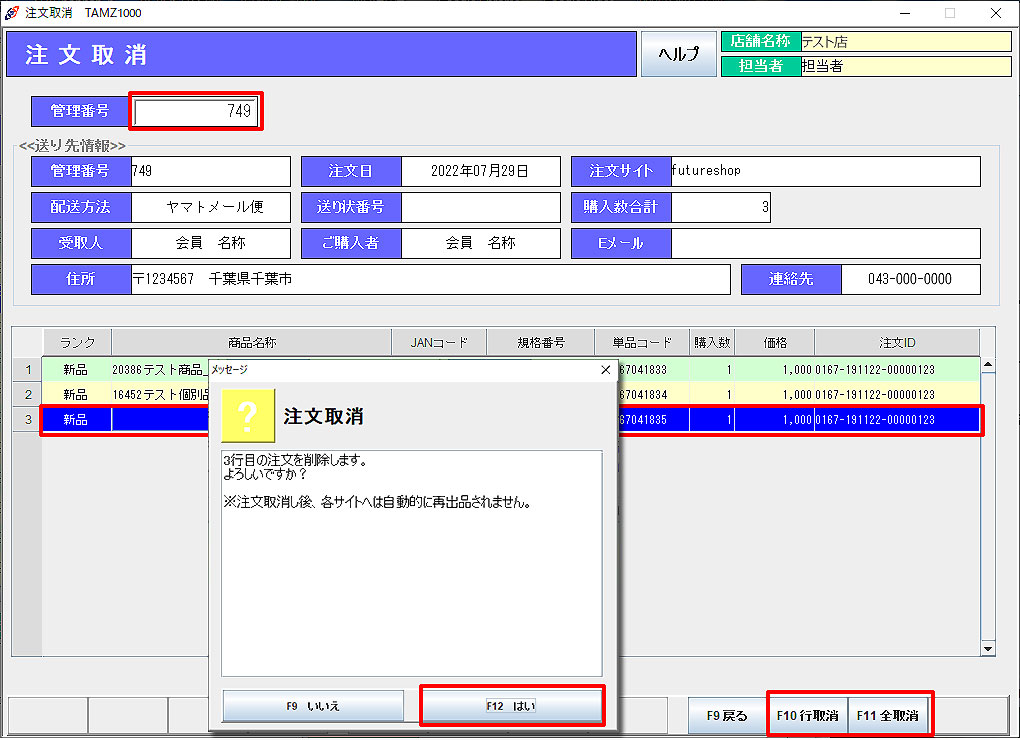 3.「F11全取消」、または明細の中から注文を取消したい商品