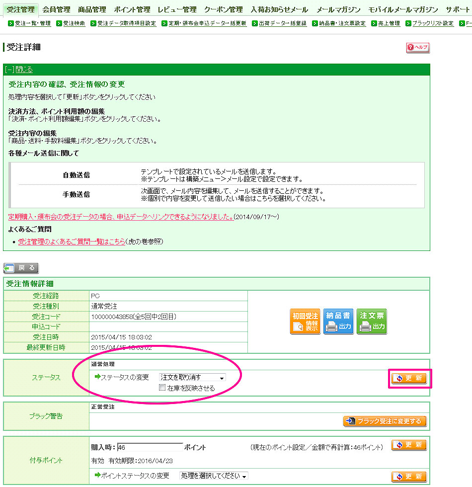 受注情報詳細のステータスを「注文を取り消す」に変更し、