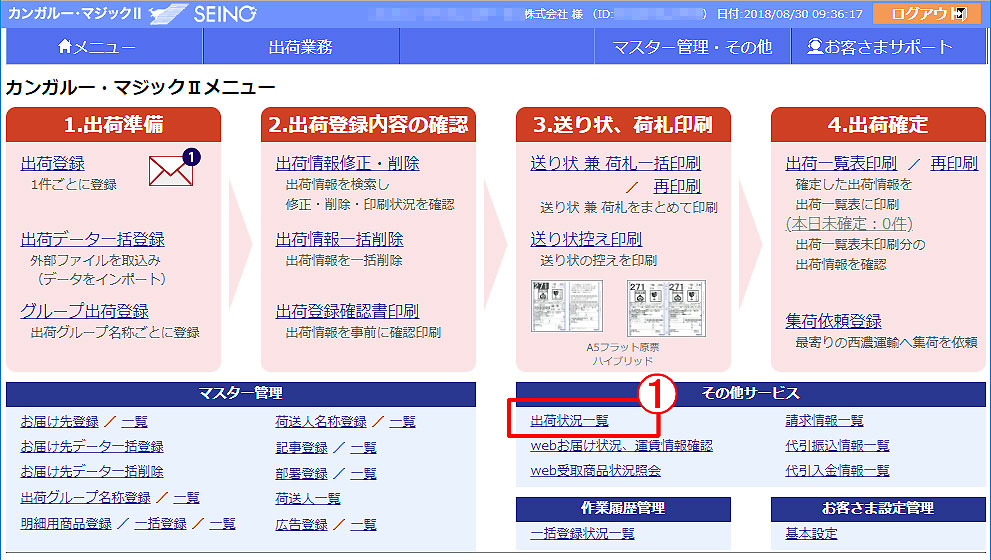 ① メインメニュー「その他サービス」の「出荷状況一覧」をクリックします。