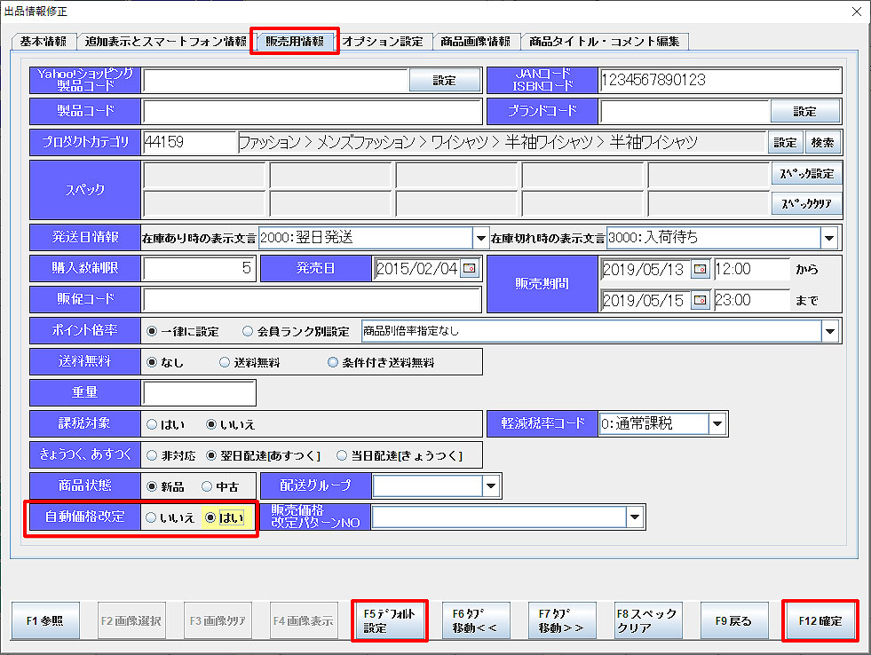 ※ 「F5ディフォルト設定」をクリックすることで、次回より自動価格改定は「はい」が選択された状態がディフォルトとなります。