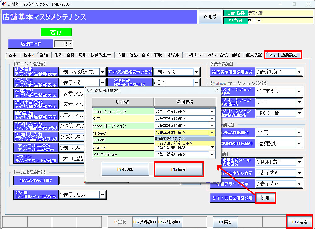 サイト別初回価格設定 業務メニュー:「店舗設定」→処理メニュー:「店舗基本マスタ(ネット連動設定)」を開きます。