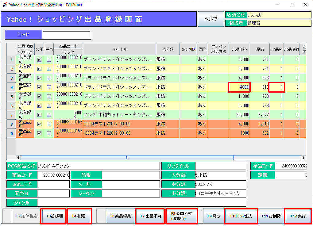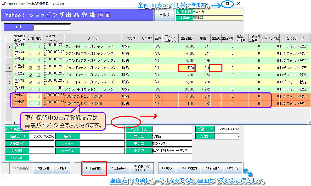 • 「F7出品不可/出品可」:選択した商品を出品しない/する