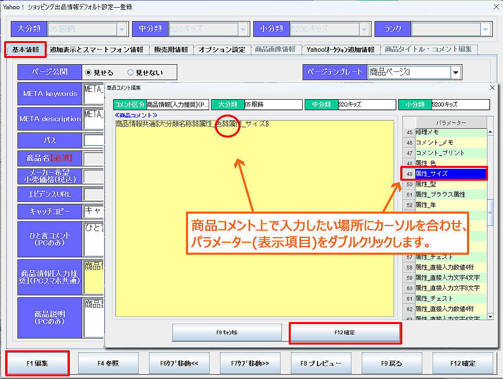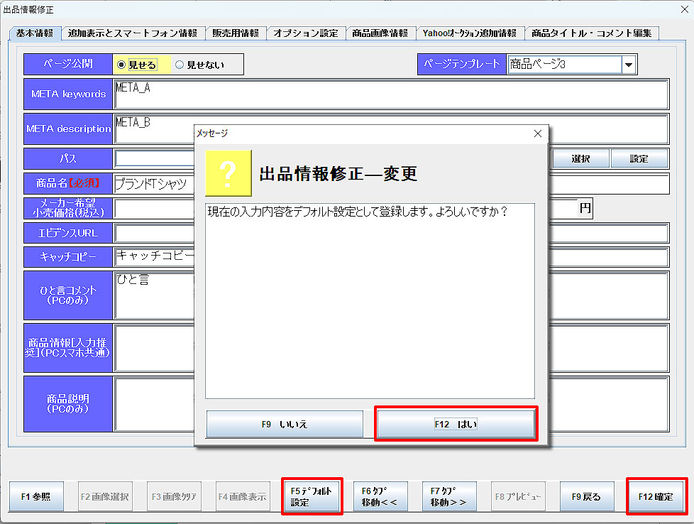 デフォルト設定後「F12確定」で出品情報の設定を確定してください。