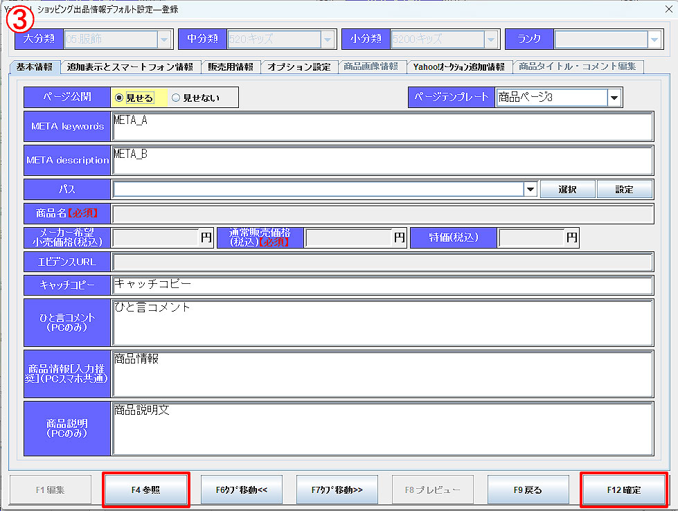Yahoo!ショッピング出品情報ディフォルト設定 ③ Yahoo!ショッピング出品情報ディフォルト設定-変更画面が表示されます。 出品情報を編集し、「F12確定」で変更を確定します。
