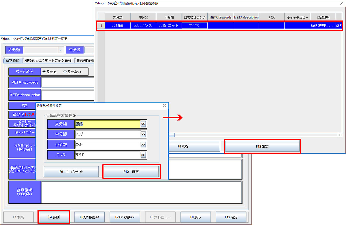 楽天出品情報参照 【出品情報ディフォルト設定】画面で「F4参照」をクリックします。【分類ランク条件指定】画面が表示されます。 検索条件を指定して出品情報を抽出します。 利用したい出品情報を選択して「F12確定」をクリックすると、そのデータが反映されます。 編集して新しく登録することができます。