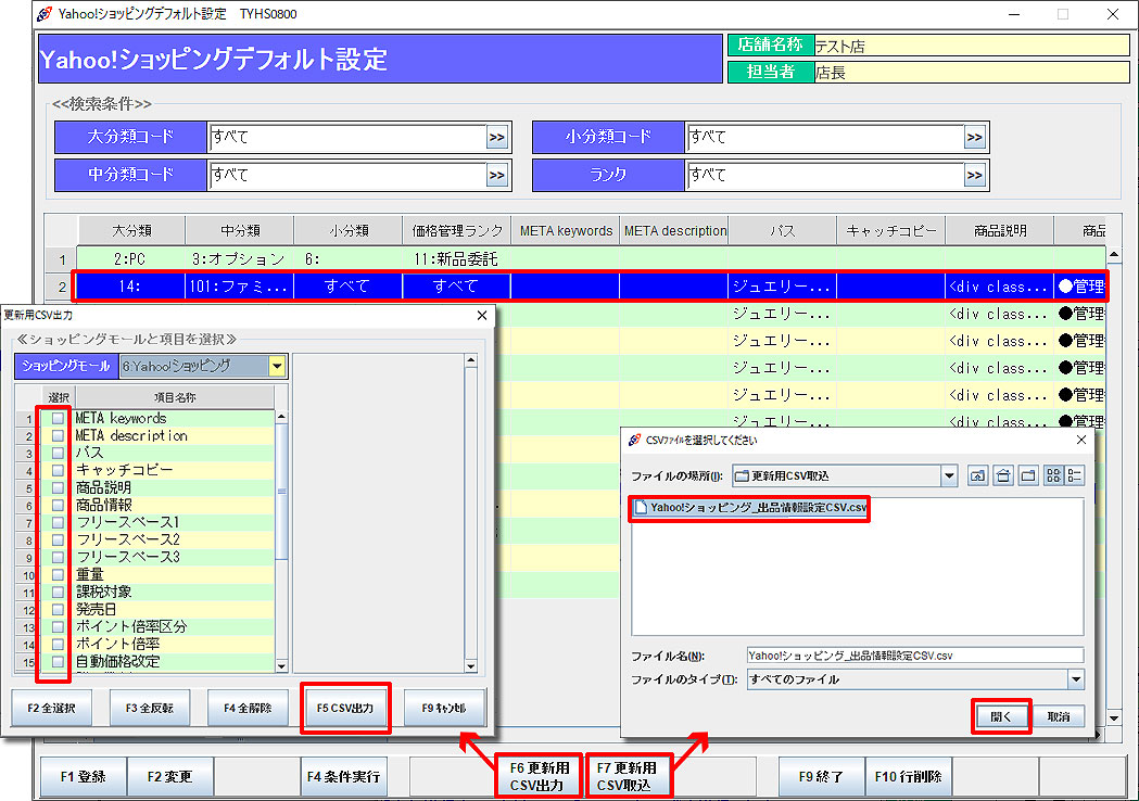 更新用CSV出力・取込 【出品情報設定】画面で編集を行いたい出品情報を選択し「F6更新用CSV出力」をクリックします。【更新用CSV出力】画面が表示されます。 CSVに出力したい項目の選択列にチェックを入れ、「F5CSV出力」をクリックします。 CSV編集ツールで編集後、「F7更新用CSV取込」より取り込みます。