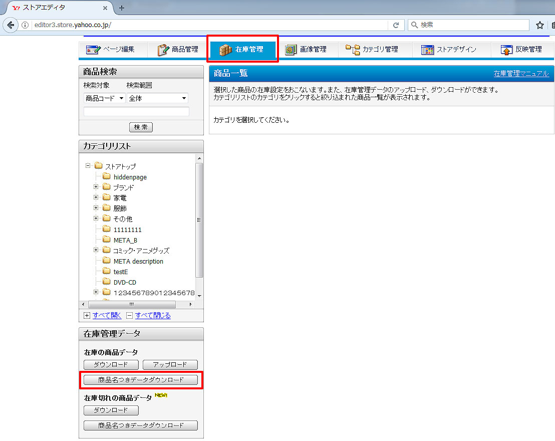 1.ストアクリエーターPro「在庫管理>在庫管理データ」より出品データ(CSVファイル)をダウンロードし、パソコン上の任意の場所に保存します。