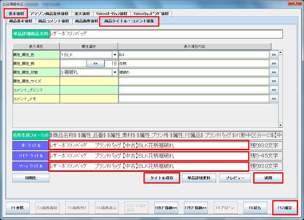 基本情報の「商品タイトル・コメント編集」で表示項目内容の編集を行い「適用ボタン」を押すと、商品名称・コメントに一括で反映されます。