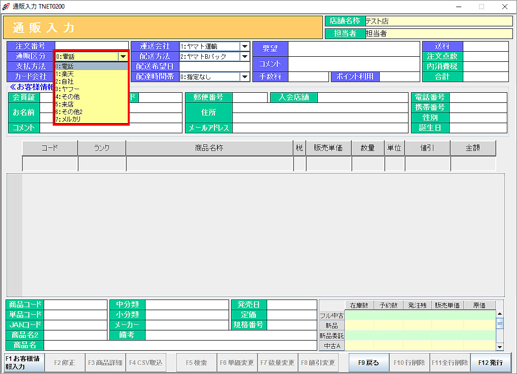 本部システムで登録した通販区分が各店舗の「通販入力画面」で選択可能となります。