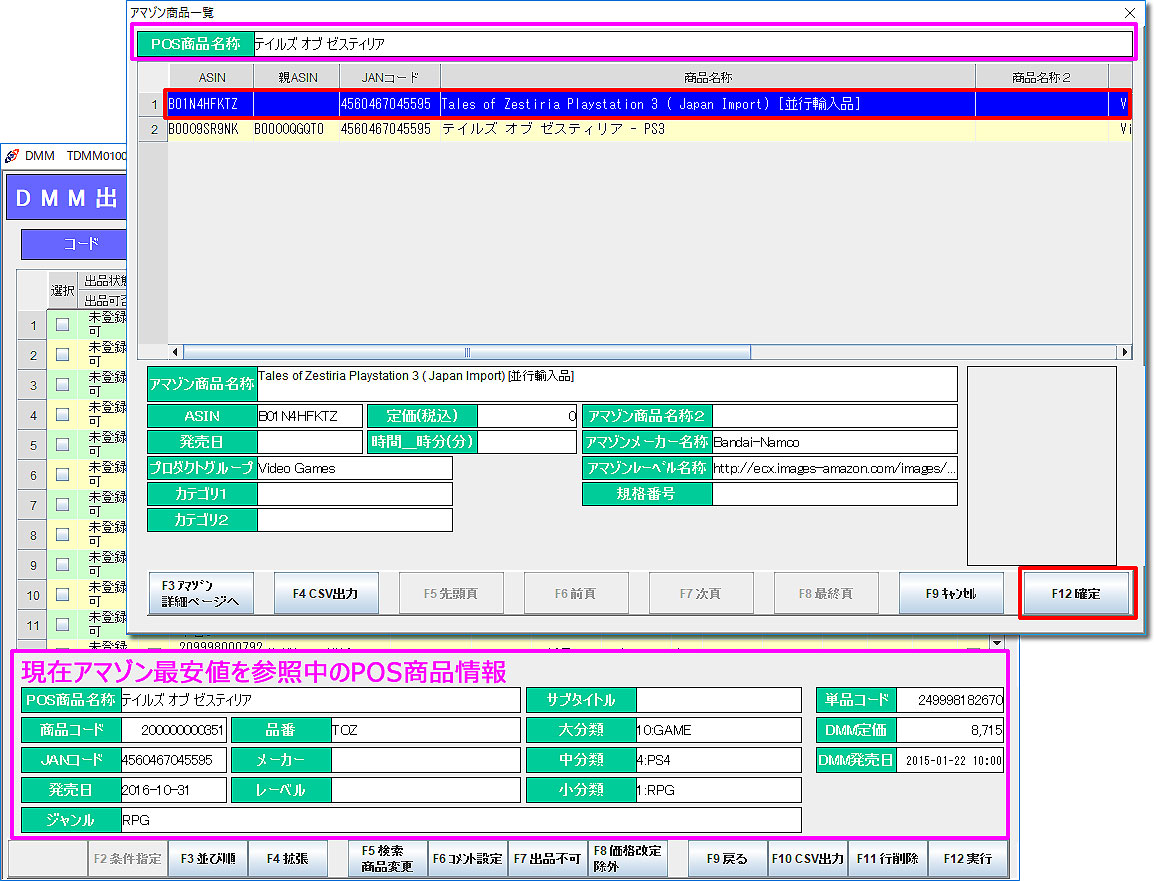 アマゾン連動を利用している場合かつ初回出品時は、アマゾン商品情報が呼び出され、アマゾン最安値を取得します。 出品商品の「JANコード」もしくは「規格番号」がアマゾン上の商品と一致する商品が複数ある場合は、「アマゾン商品一覧」が別画面で表示されます。 該当する商品を選択して「F12確定」をクリックしてください。