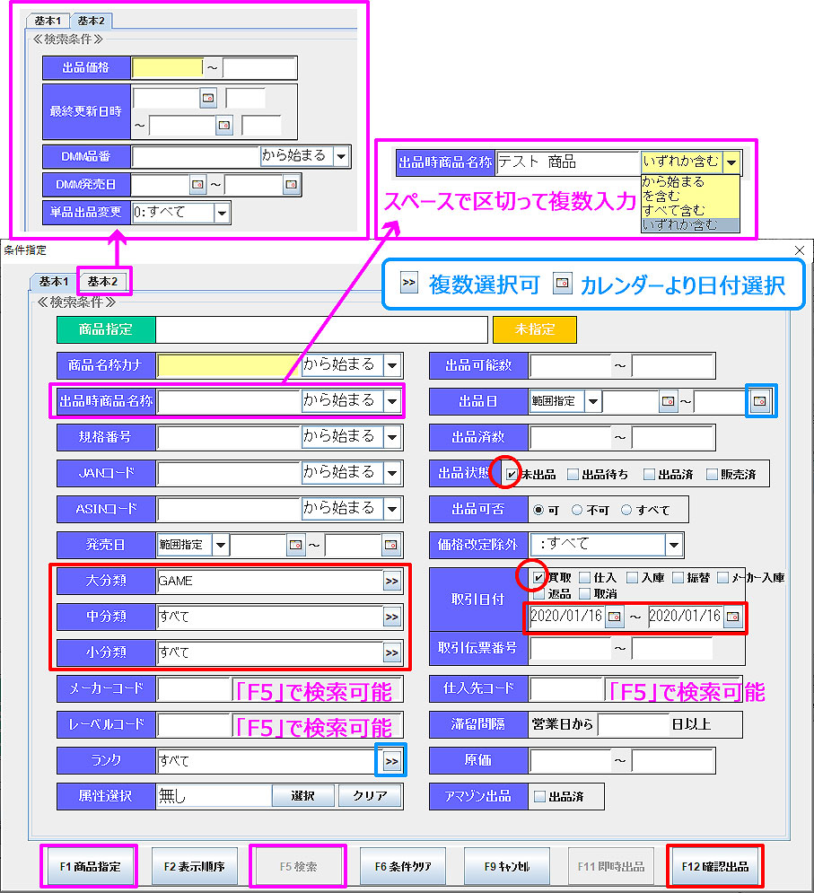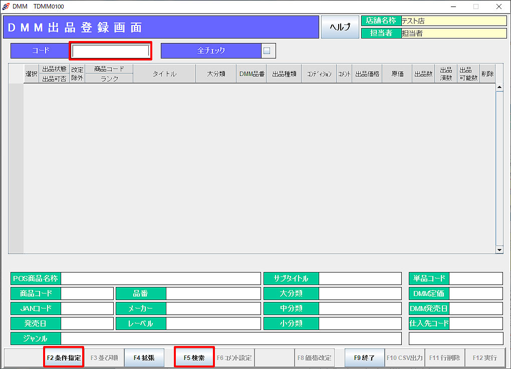 ※ 「F1商品指定」より「商品コード」「JANコード」「規格番号」「単品コード」で商品を指定することもできます。