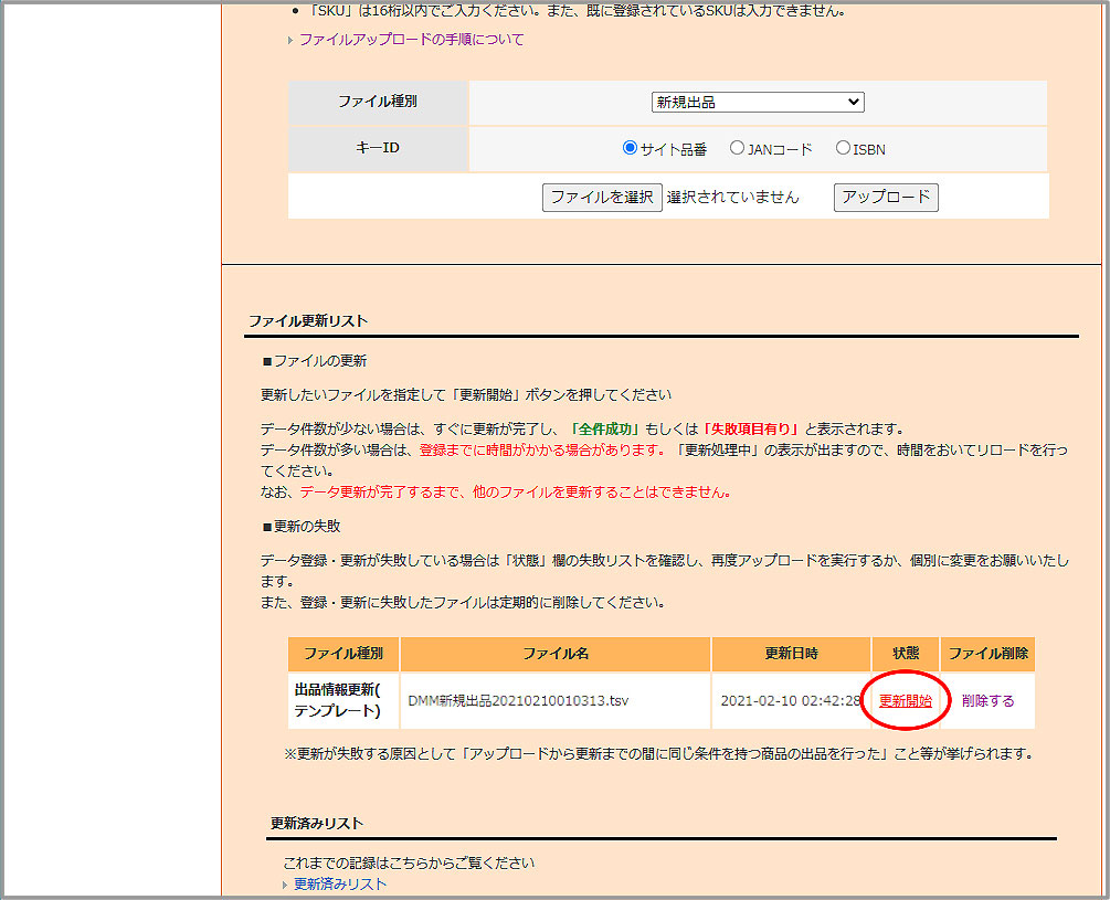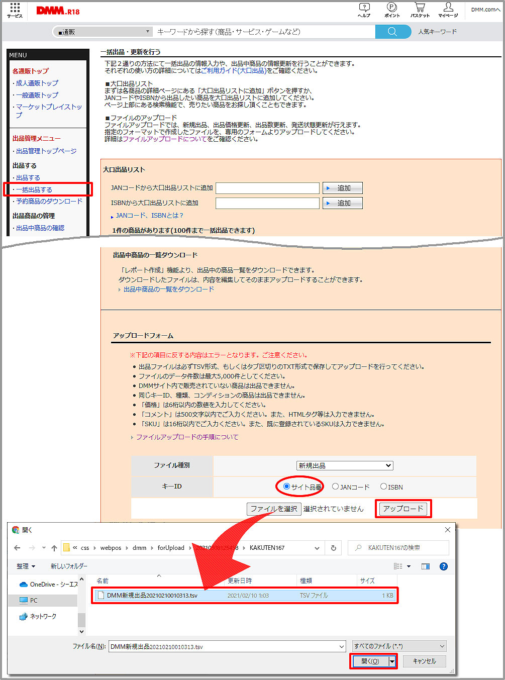 タロスから出力した出品TSVデータをDMMへアップロードします。