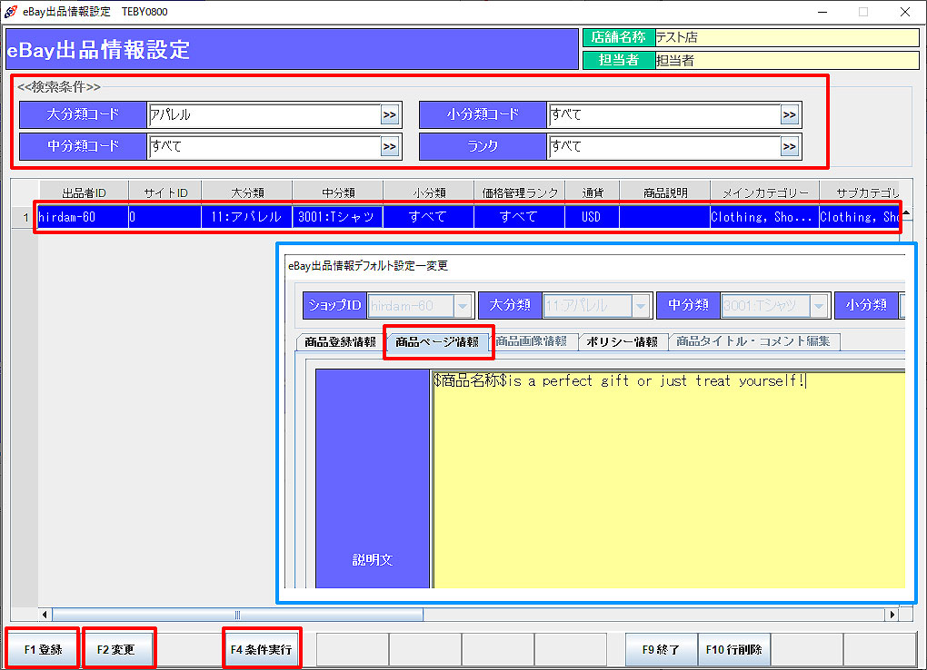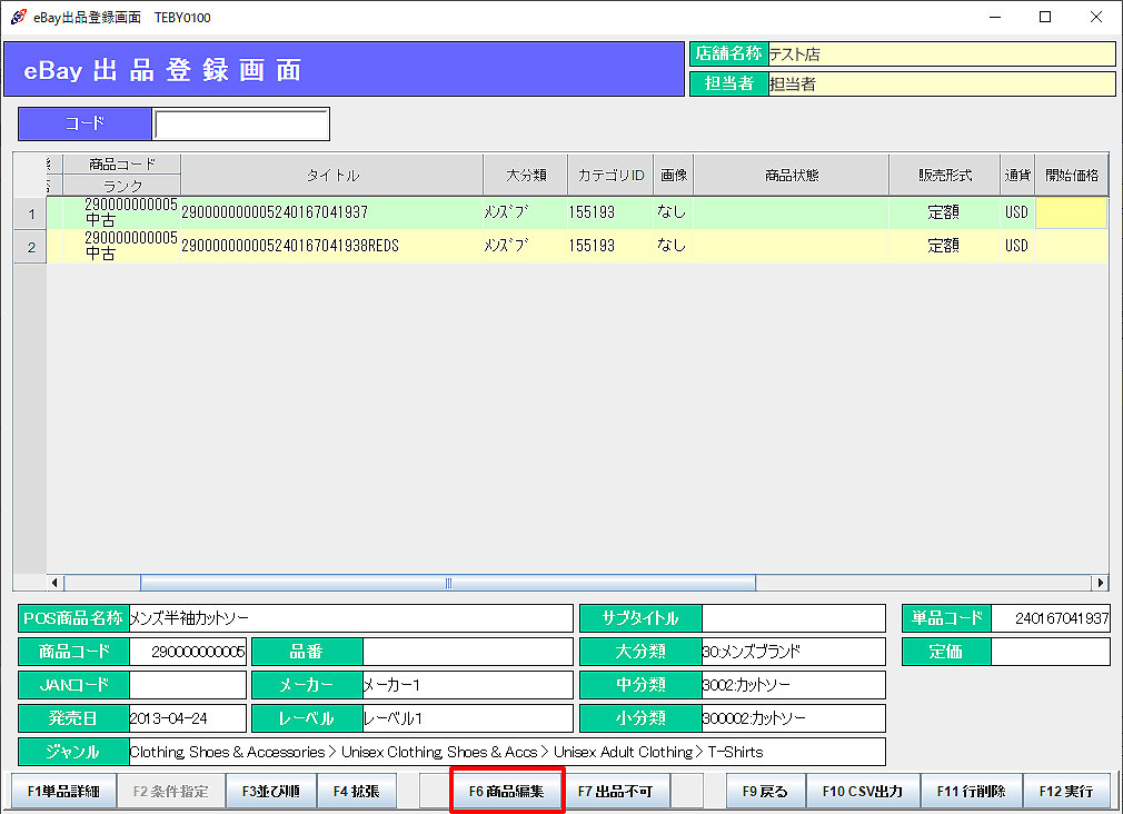 出品情報設定 出品登録商品を呼び出し、「F6商品編集」より商品タイトル・コメントの編集を行います。