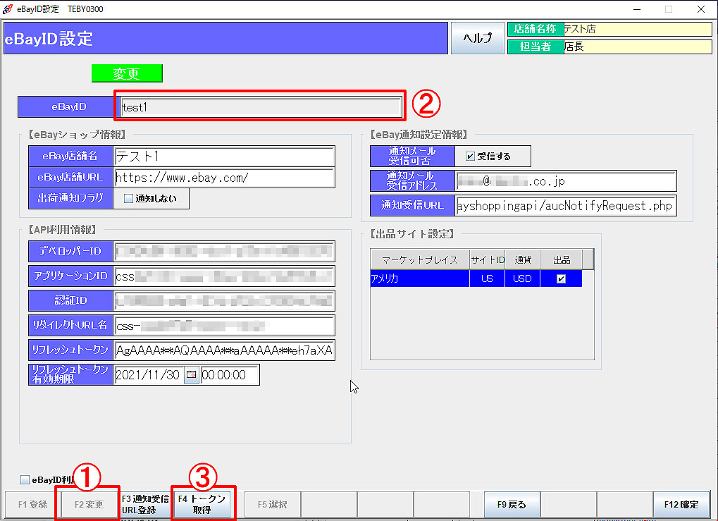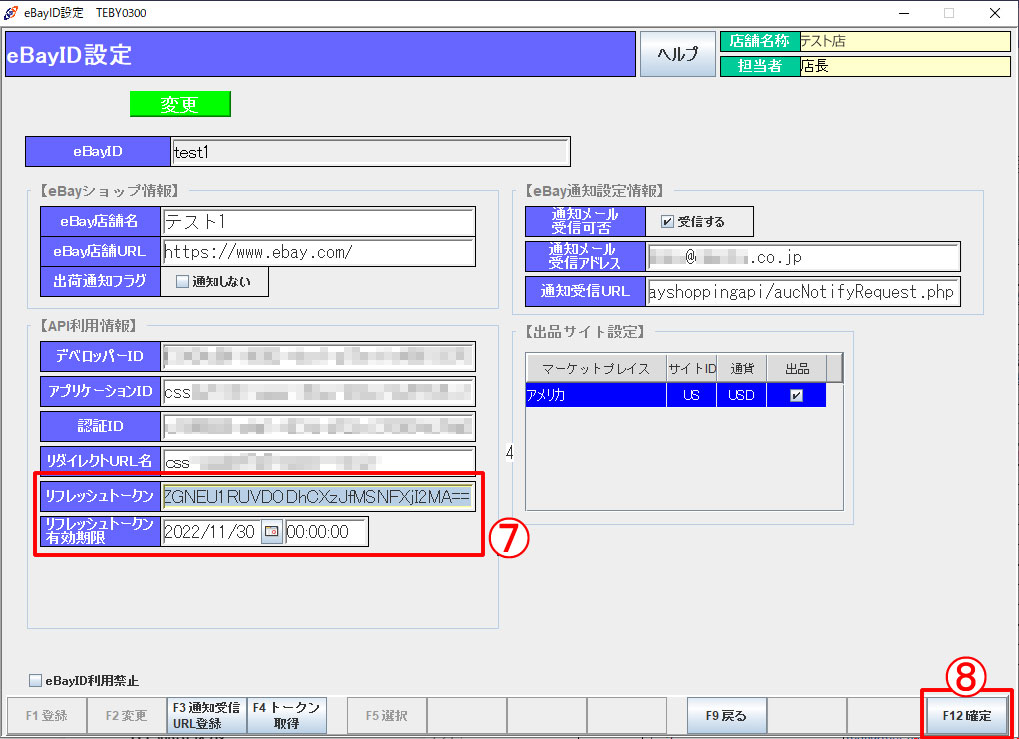 表示されます。更新時期になりましたら、リフレッシュトークンを取得してください。 - eBay通知設定情報:任意で受信メールの転送先情報を入力します。