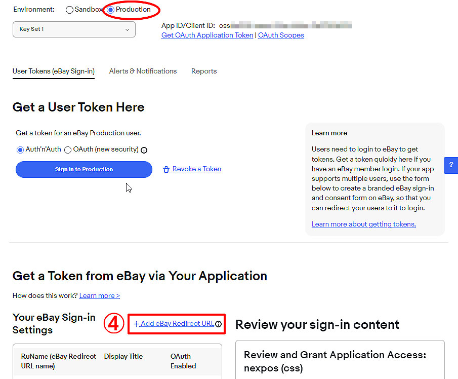 ④ 「Environment」のチェックを「Production」に変更し、「+Add eBay Redirect URL」をクリックします。
