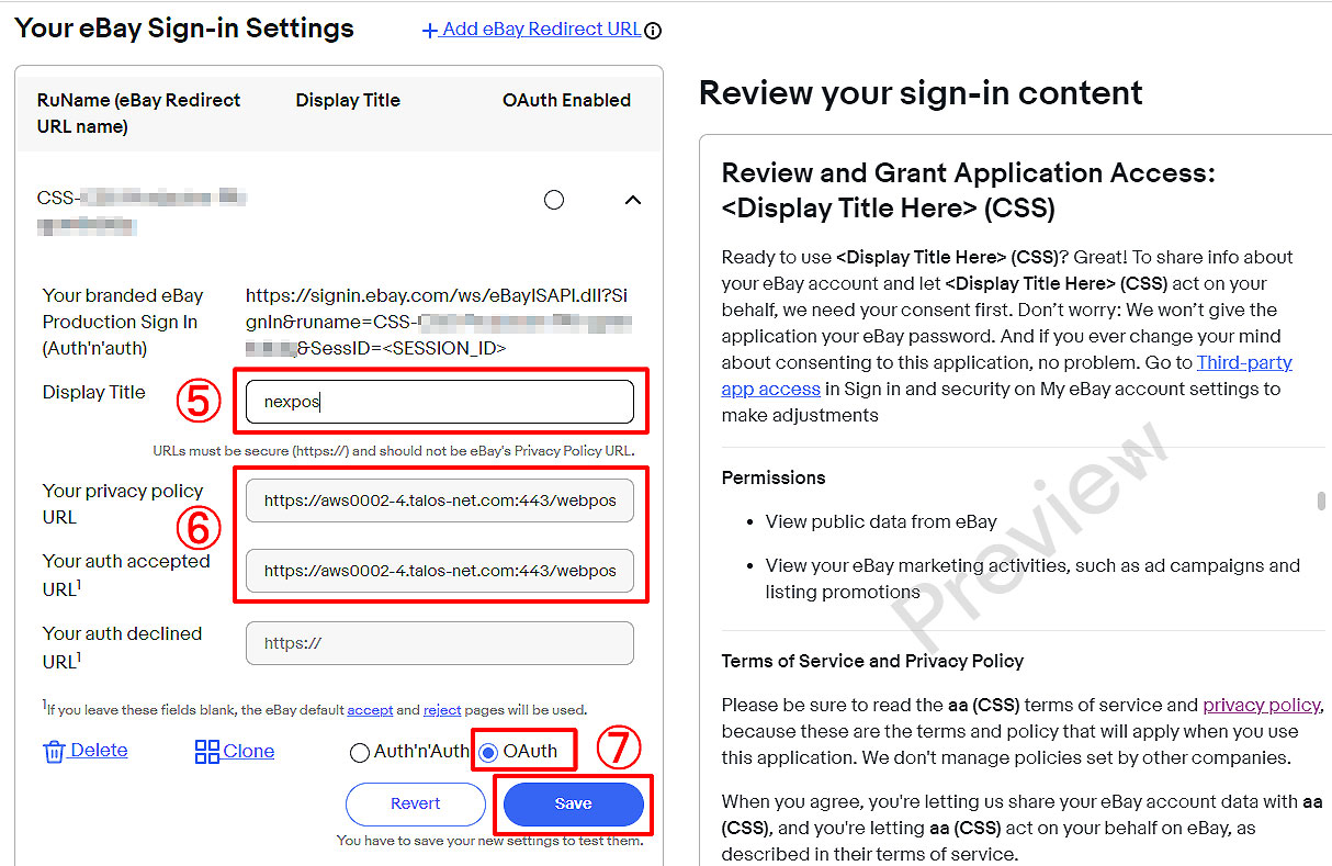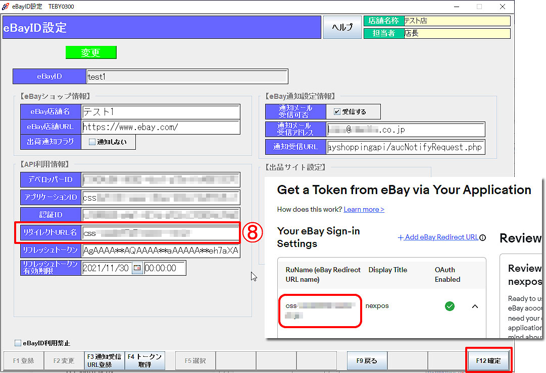 ⑧ タロスのeBayID設定画面に「リダイレクトURL名」を設定します。