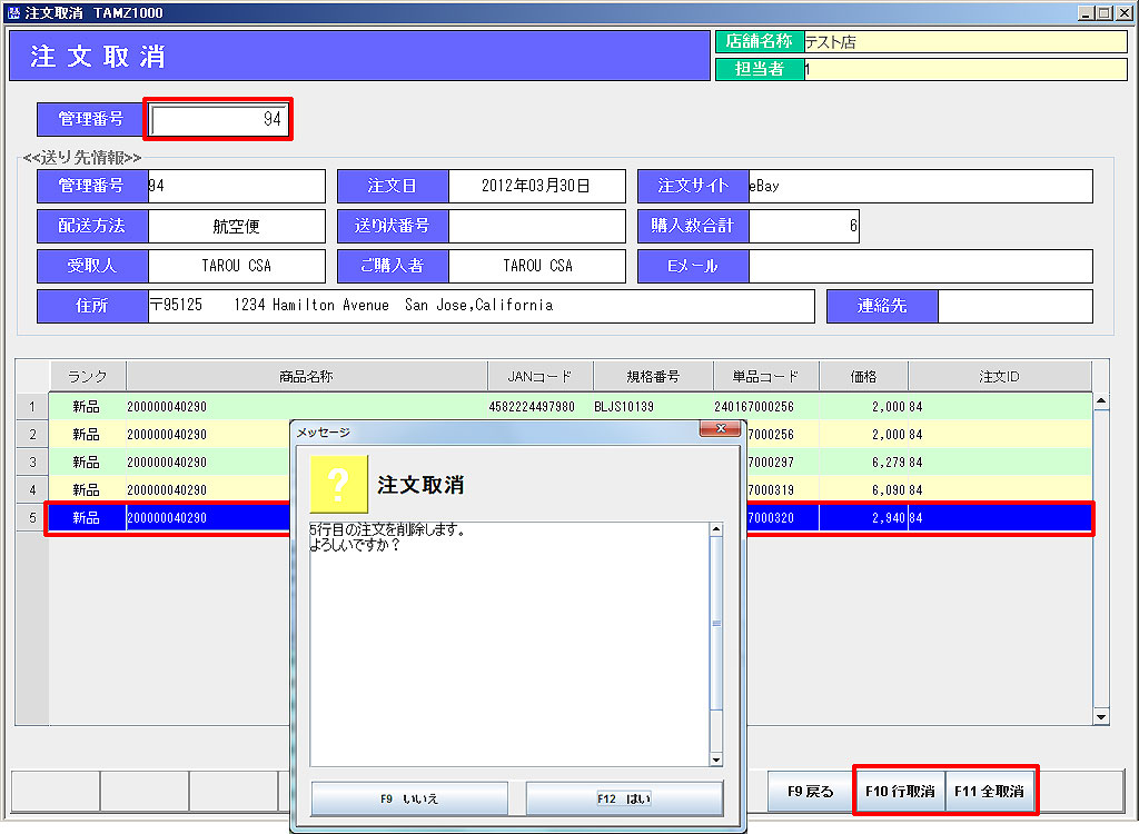 3.「F11全取消」、または明細の中から注文を取消したい商品行を選択し、「F10行取消」をクリックします。 注文の取消確認メッセージが表示されます。 「F12はい」で注文が取消されます。