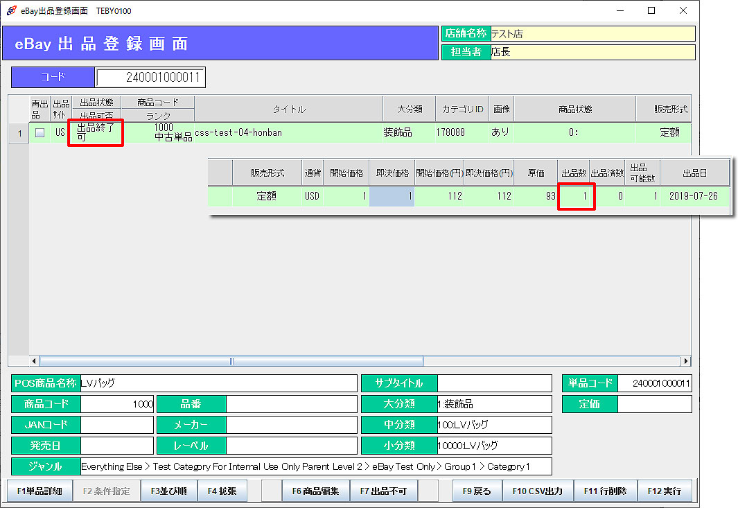 出品状態が「出品終了」、出品数に「1」が入っていることを確認し、「F12実行」をクリックします。