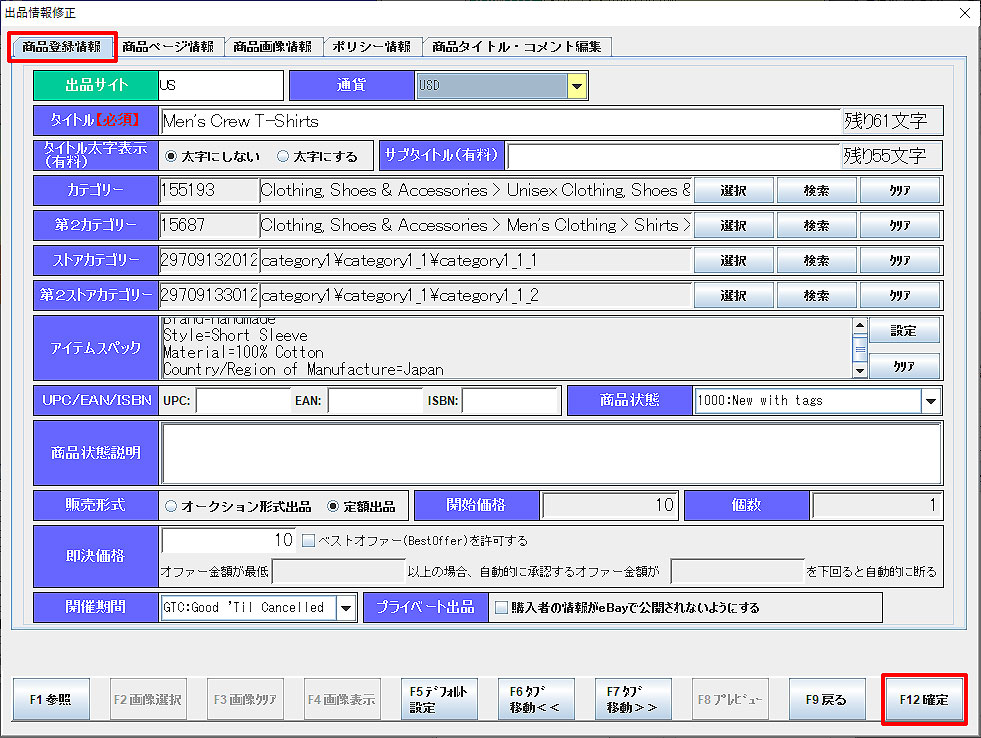 F12確定」で商品情報を保存し、出品登録画面に戻ります。