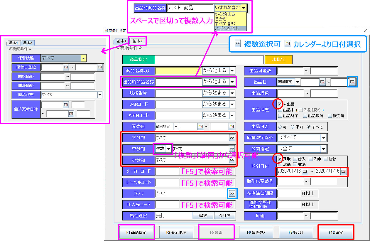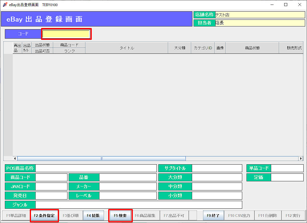 ※ 「F1商品指定」より「商品コード」「JANコード」「規格番号」「単品コード」で商品を指定することもできます。