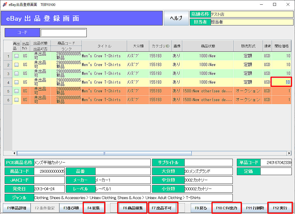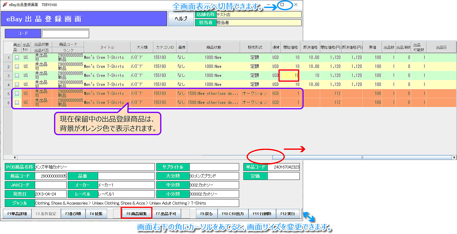 • 「F7出品不可/出品可」:選択した商品を出品しない/する
