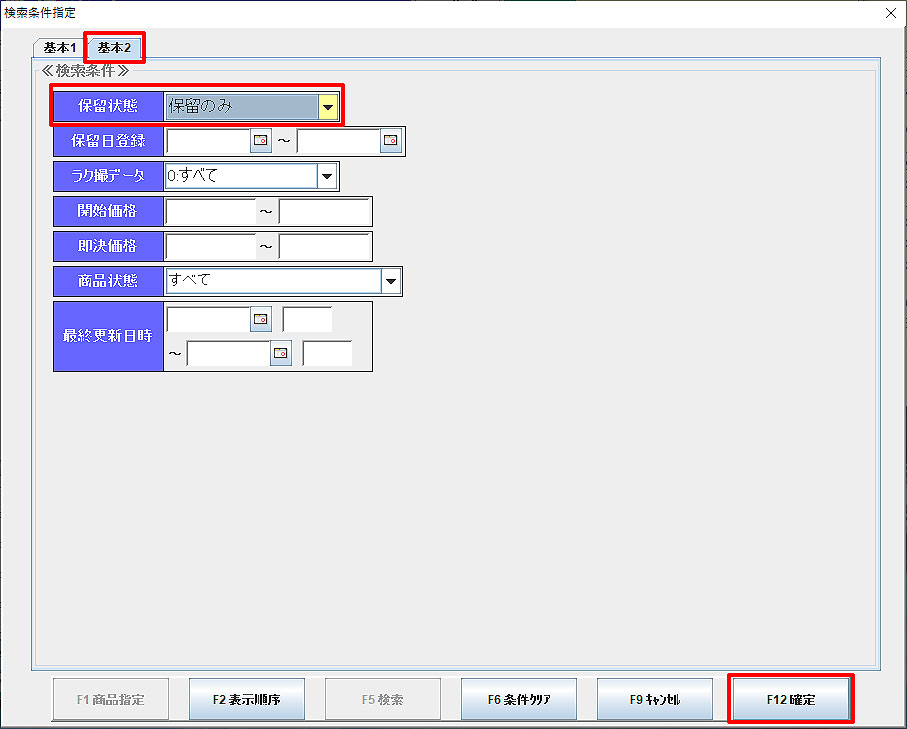 出品条件画面 ※ 保留データの呼び出しは、「F2条件指定」より「保留状態:保留のみ」を選択、他条件を指定して抽出する方法や、 「F4拡張」より「保留データ読込」で現在保存されている保留データ全てを呼び出す方法もあります。