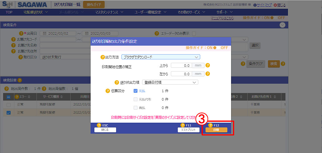 e飛伝Ⅲ送り状印刷一覧 ② STEP2で作成・取込で登録した送り状を印刷します。
