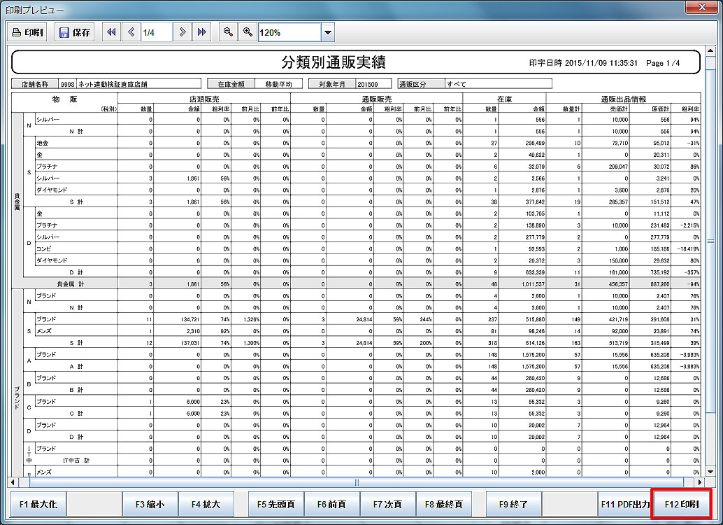 通販サイトごとに品代、税金額、送料や代引き手数料、利用ポイントなどの売上明細がご覧いただけます。 「F12印刷」で印刷します。