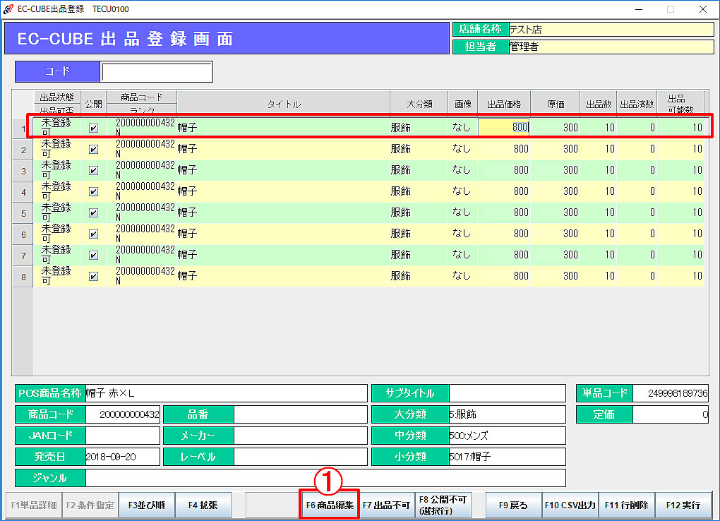 同一商品コードの内 1行を選択 して「F6商品編集」をクリックします。