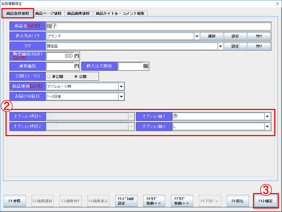 オプション値1・2には、商品コードに紐付いたバリエーションが選択されています。 編集が必要な項目がありましたら編集します。