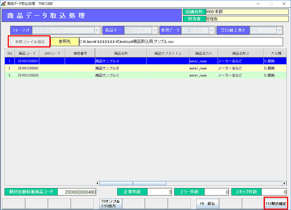 業務メニュー:「メンテナンス設定1」→処理メニュー:「商品データ取込」を開きます。
