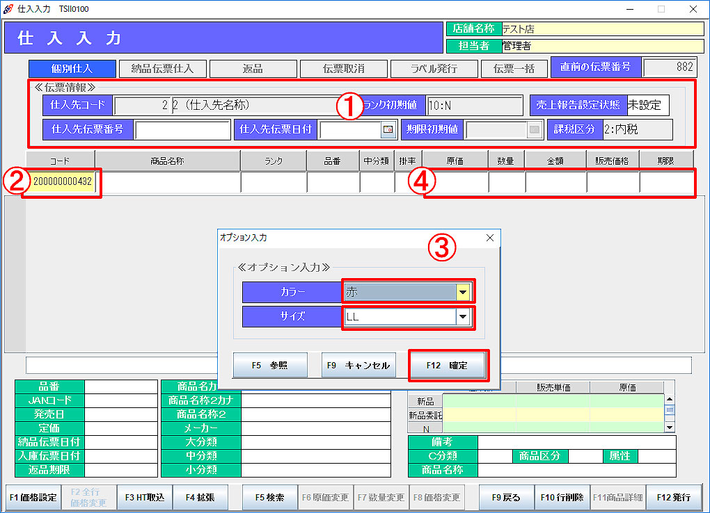 オプション入力画面では、「4.」で紐付設定を行ったバリエーション項目の選択肢が選択可能になっております。 選択して「F12確定」で確定します。