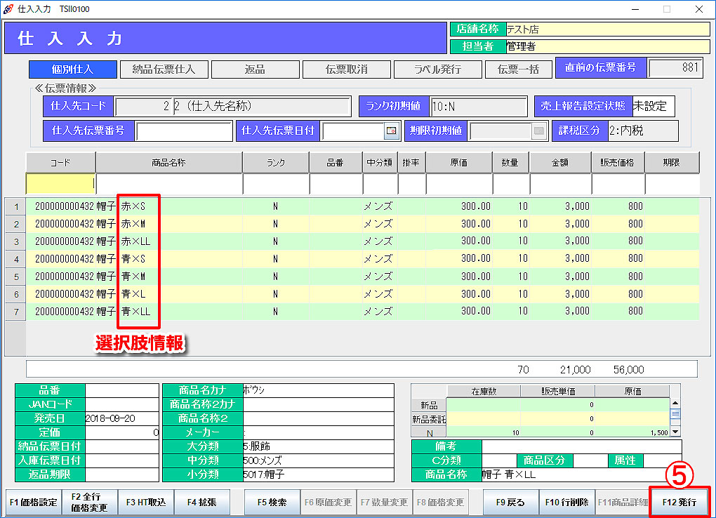 ⑤ 「F12発行」で仕入を確定し、ラベルを発行します。