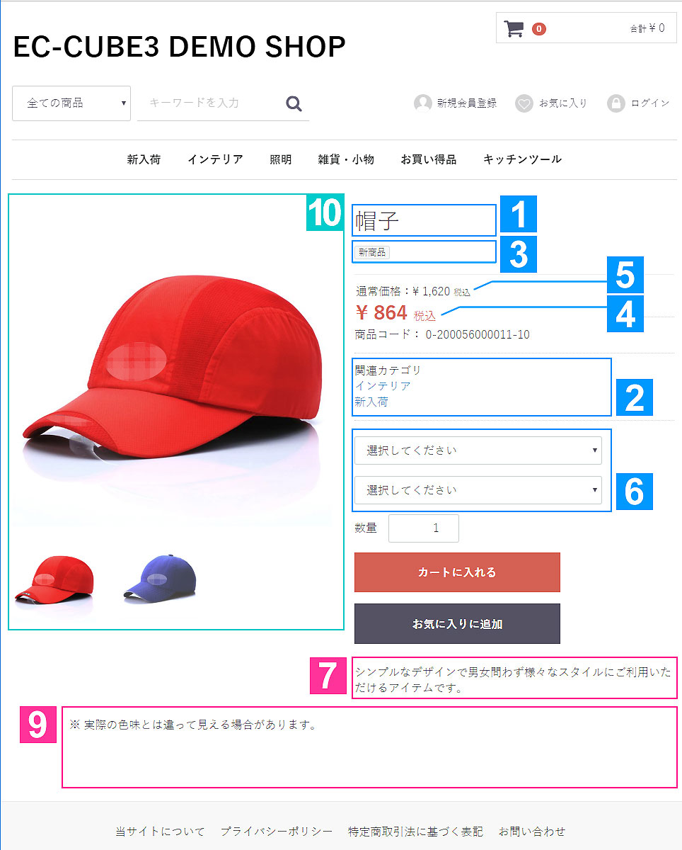 ※ 「商品説明(一覧)(詳細)」「フリーエリア」他コメントは 「EC-CUBE設定-コメント設定