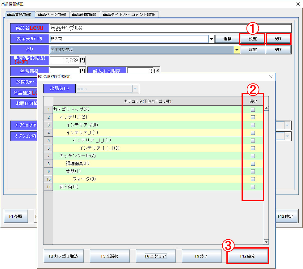 カテゴリ一覧より、登録する商品をどのカテゴリに属させるのかを設定します。