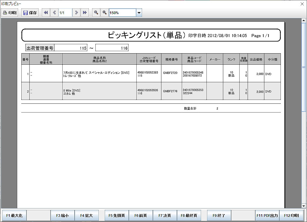 F12印刷」をクリックして、ピッキングリスト(または納品書) を印刷します。印刷をしない場合は「F9」で終了します。