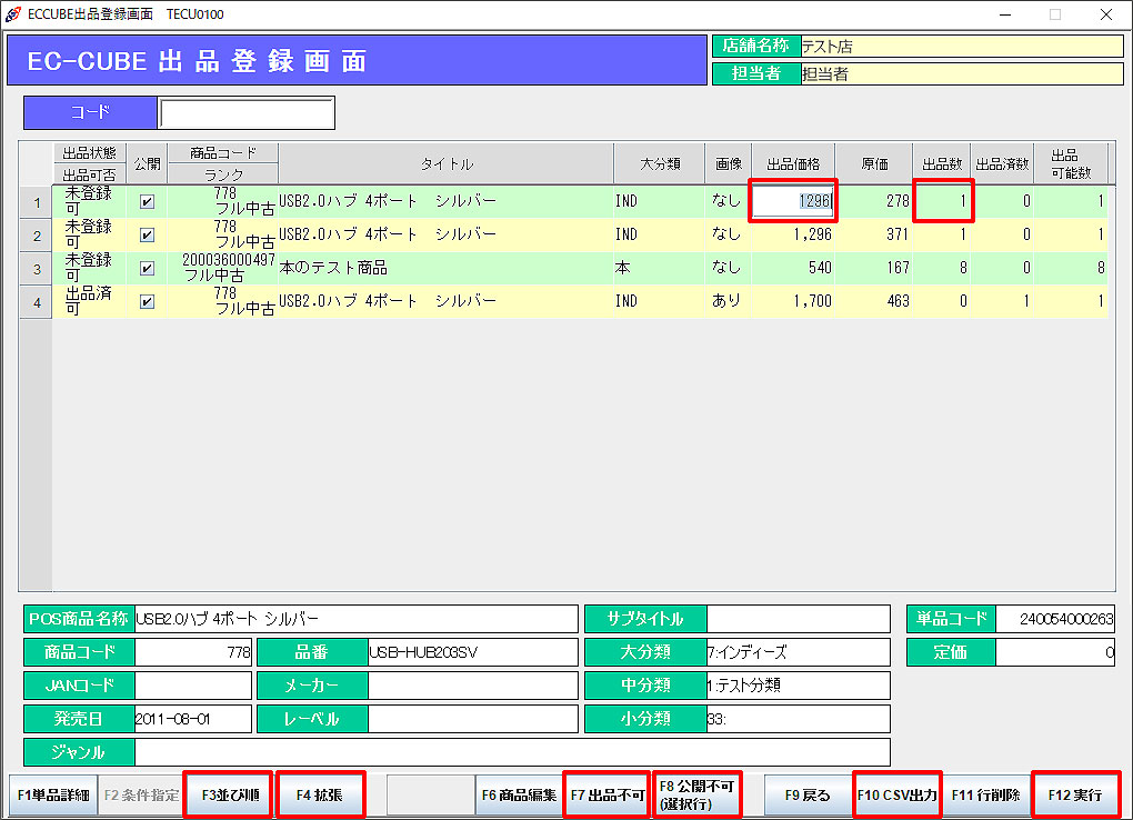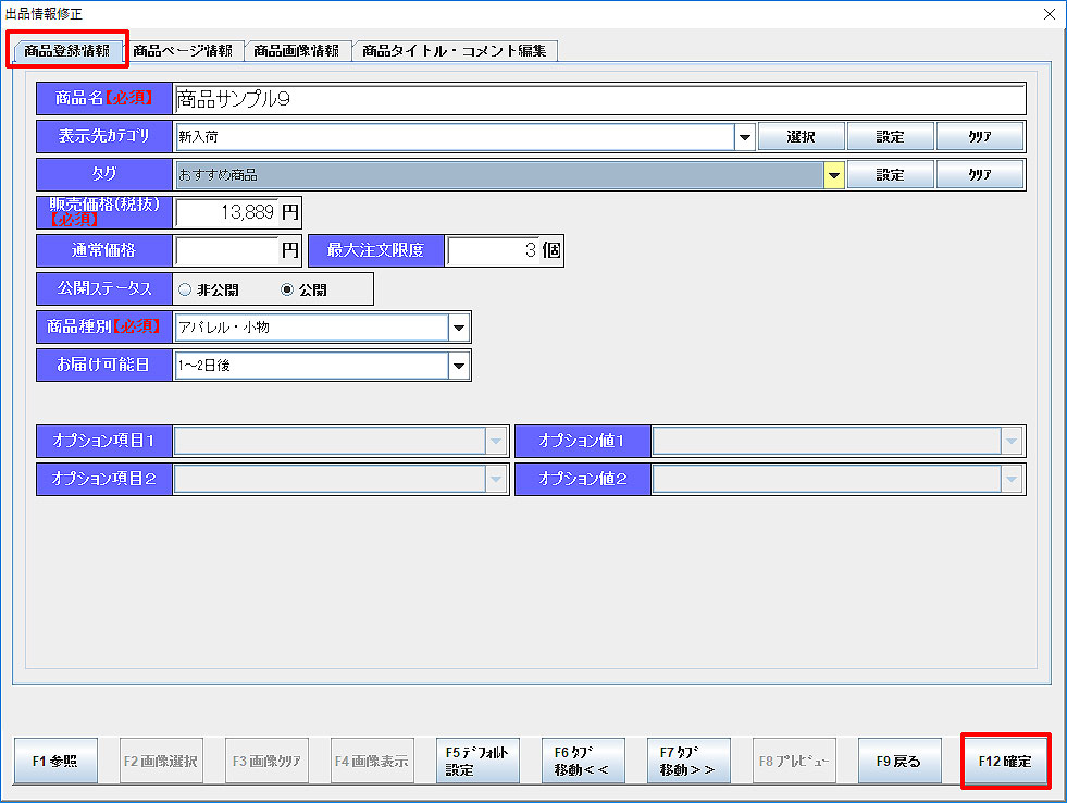 • 「F8公開不可/公開」:選択した商品は倉庫に入る/出品状態