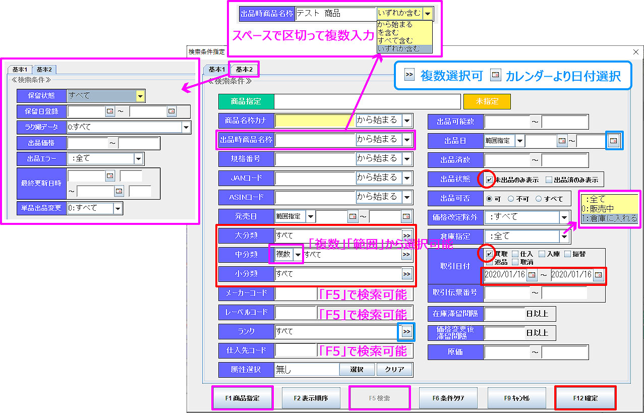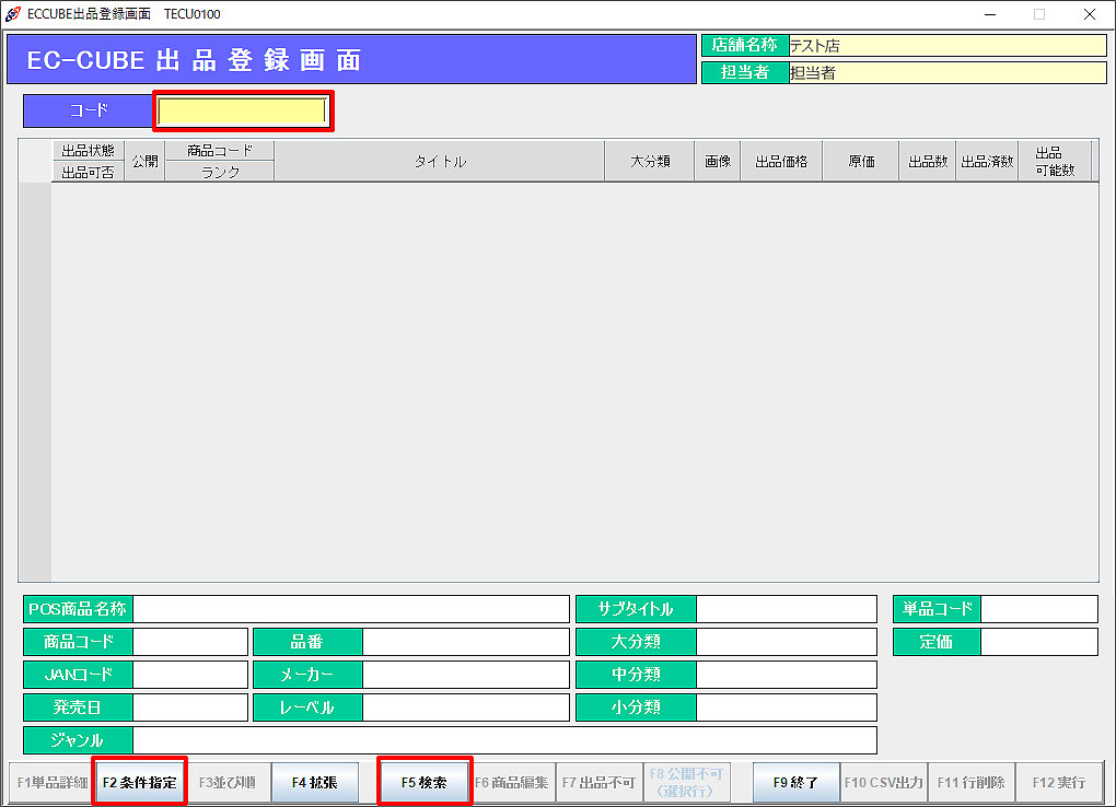 ※ 「F1商品指定」より「商品コード」「JANコード」「規格番号」「単品コード」で商品を指定することもできます。