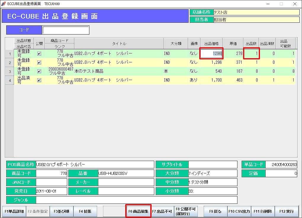 出品登録を行う商品の出品価格、若しくは出品数入力欄をクリックして選択し、「F6商品編集」をクリックします。