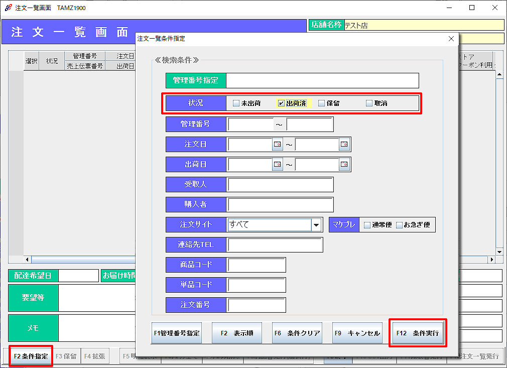 ③ 「状況」を選択し、その他検索条件を入力して「F12条件実行」