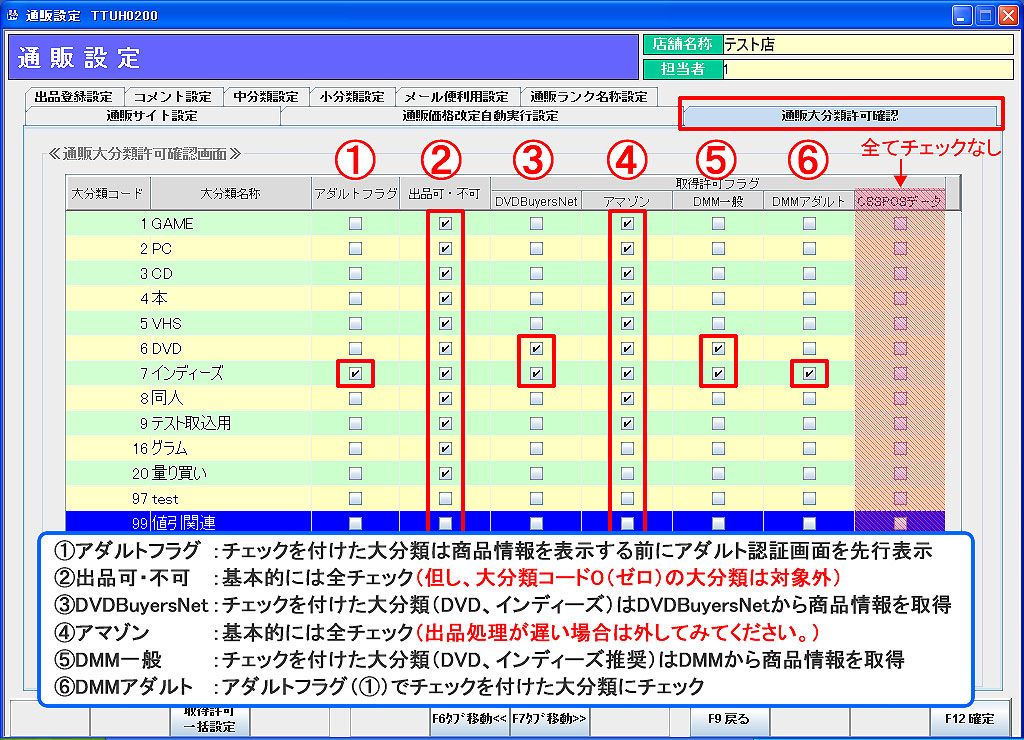 通販大分類許可確認:大分類毎にアダルト認証・商品の出品・商品情報の取得可否を設定します。