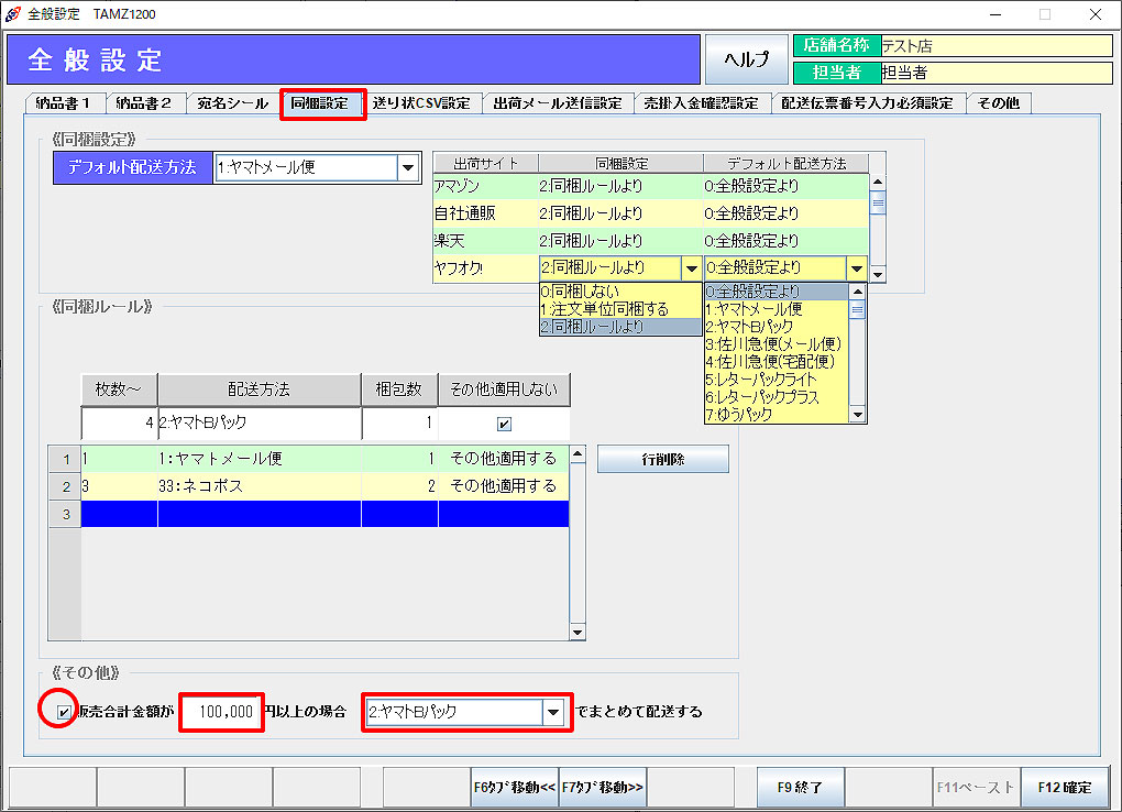 例)販売合計金額が100000円以上の場合、ヤマトBパックでまとめて配送する