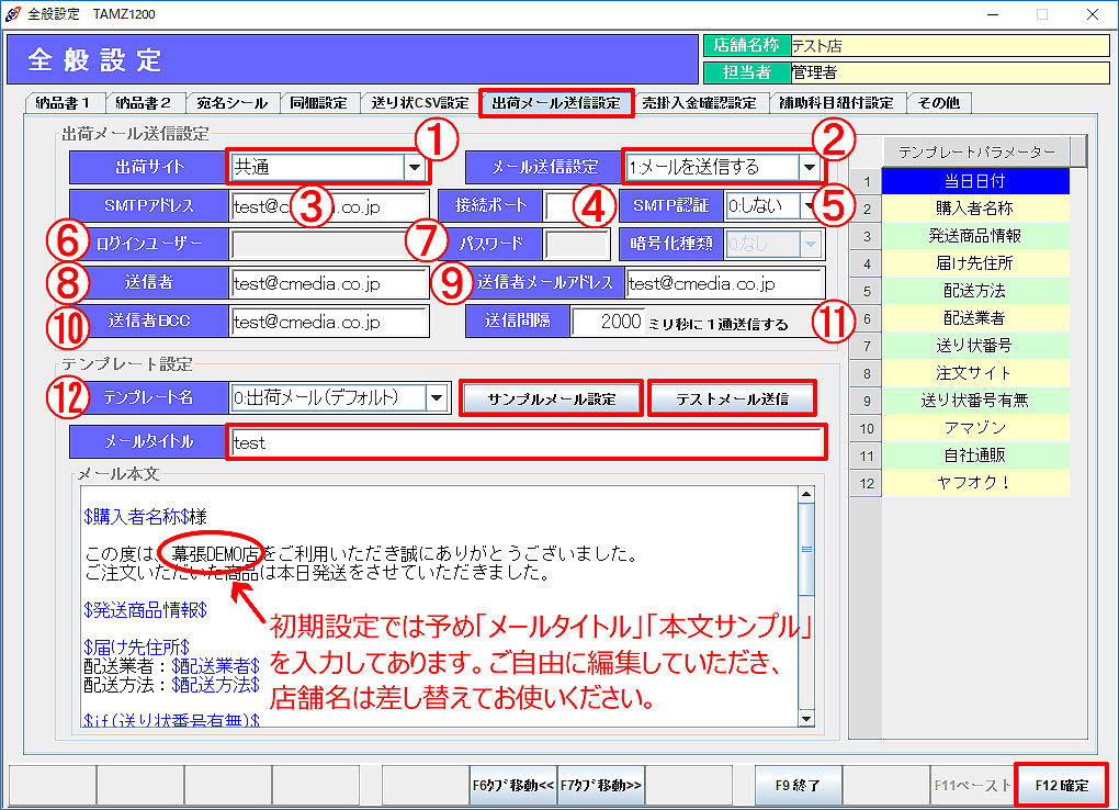 出荷メール送信設定:メール送信情報の設定、メール本文の編集を行います