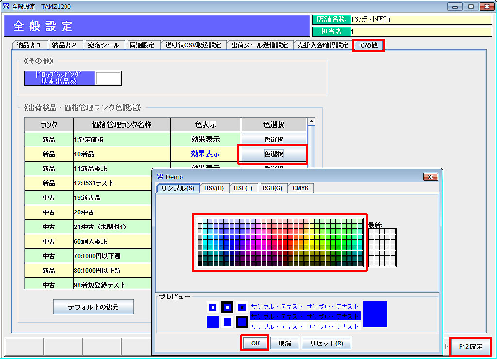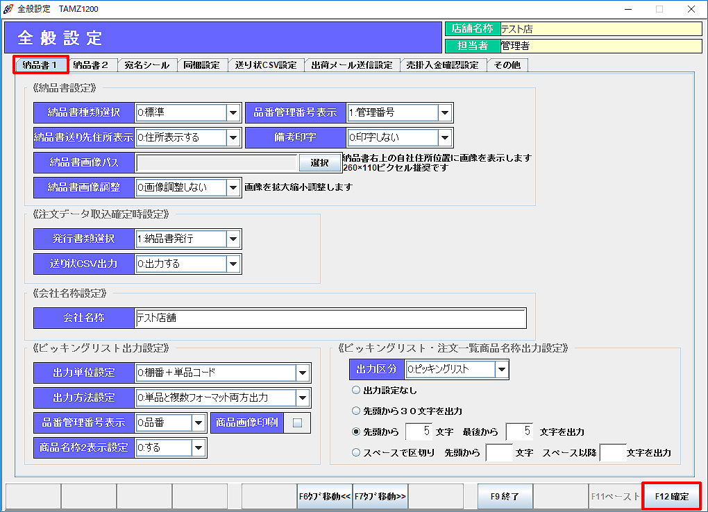 各タブ全ての設定終了後、「F12確定」クリックで設定を更新します。