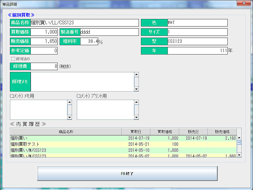 「F8詳細」で選択行の単品詳細を確認できます。(参照のみ。編集はできません。)