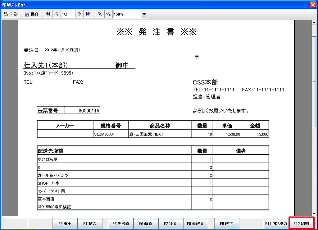 「F12発注書印刷」:選択した行(青色に反転)の伝票を発行します。