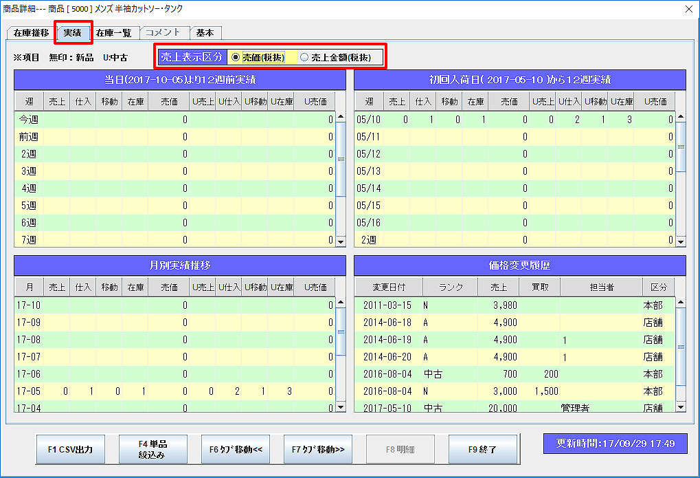 「F4単品絞込み」:価格管理ランクで単品コードを絞込み、在庫推移を表示します。