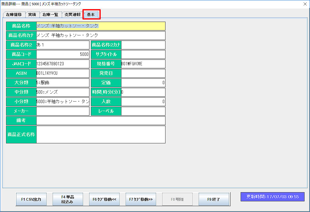 対象商品の各種名称や各種コード・分類・入数・発売日・メーカーなど基本的な情報を表示します。