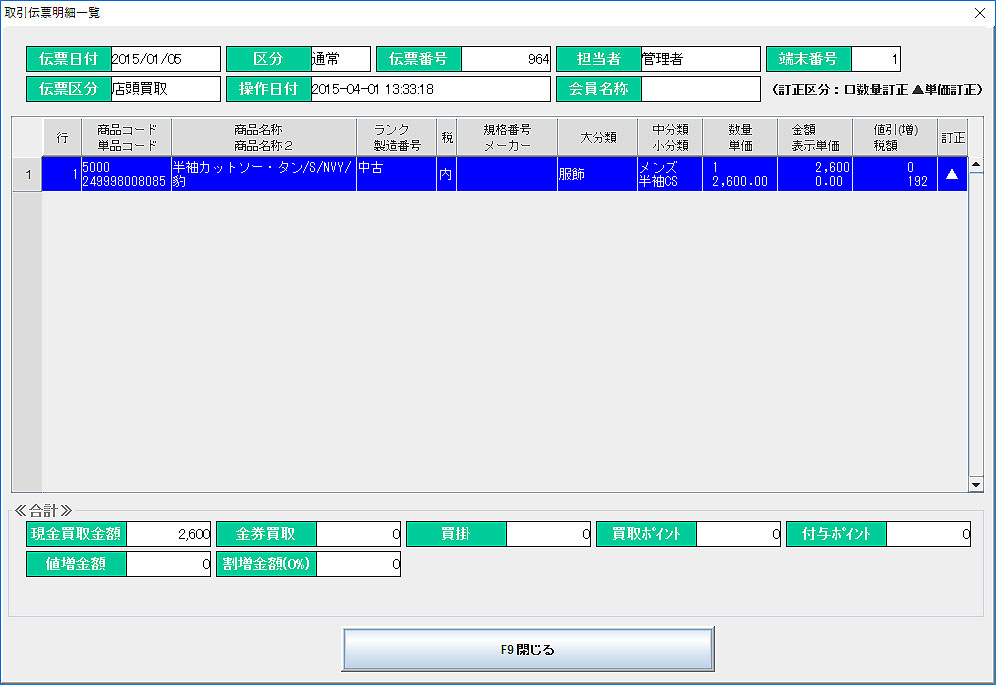 「F8明細」:選択行(青色に反転)の取引伝票明細一覧を表示します。